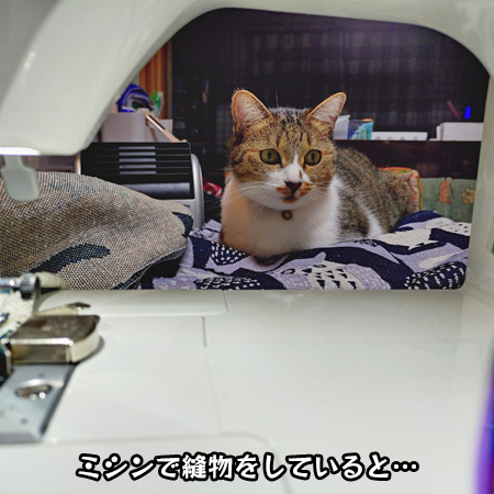 ↑↑新しいミシンで、長年そのままだったゴブラン織りの切り売り生地。端を縫って、パサーっとかけられるカバーにしようと縫ってたら…