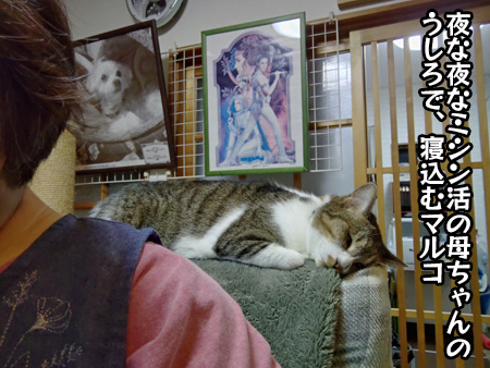 ↑↑8月前半から始めたミシン活。夜な夜なミシンをいじるお母ちゃんの後ろで、退屈そうに寝ているマルコ嬢。