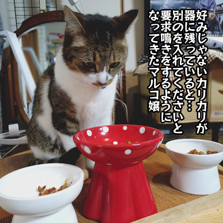 ↑↑朝、3つの器に3種類のカリカリを入れておきます。夕方には小さい器のカリカリは真ん中に入れて、小さい器には2匹用にレトルトを入れてあげます。その真ん中に入った3種類のカリカリが気に入らないらしく、他のを入れてほしくて鳴いて要求するようになりました。