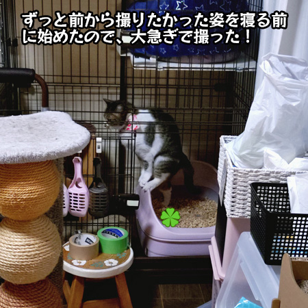 ↑↑この姿…ずっと笑ってみてた姿、なんでこんな格好で出すのよと、いつも笑ってた。そして、撮り損ねてた姿。ついに来たシャッターチャンス!寝る前で私はベッドに腰かけようとしているときに見つけたので、慌てて大急ぎでスマホで撮った、撮れた、撮ったどー!